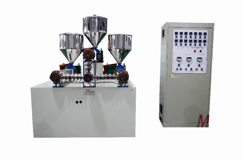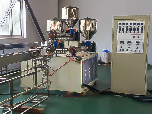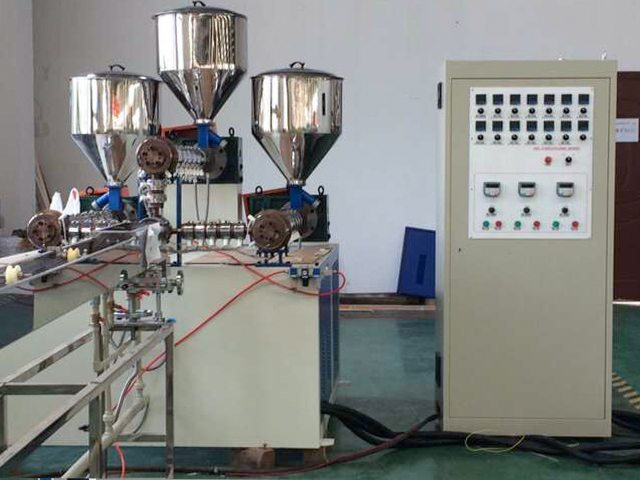 ML13A三拼色吸管共擠擠出機(jī)組由:擠出機(jī)、機(jī)頭、冷卻定型裝置、牽引切割裝置、理管輸送裝置(選配)等部分組成,生產(chǎn)三拼色的花色吸管。采用全新BM分離型參數(shù)設(shè)計(jì)的45mm直徑螺桿:長徑比28:1,塑化效果好,雙螺桿平行布置,擠出量大,出膠穩(wěn)定;是生產(chǎn)特種花色飲料吸管的專業(yè)設(shè)備。